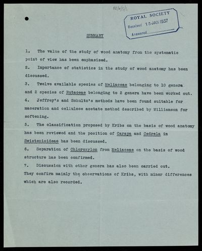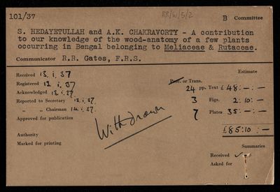 Original summary note from the Royal Society editorial department, for a paper 'A contribution to our knowledge of the wood-anatomy of a few plants occurring in Bengal belonging to Meliaceae and Rutaceae' by S [Syed] Hedayetullah and A K Chakravorty
