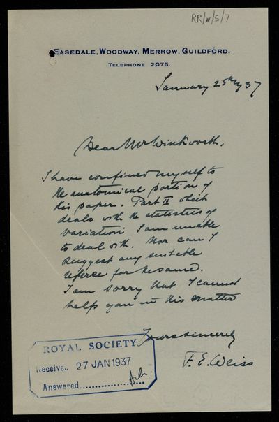 Creator: Frederick Ernest Weiss, Alexander Craig Aitken Reference number: RR/W/5/2 -