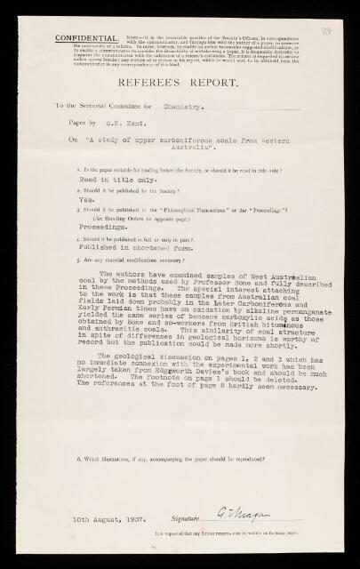 Gilbert Thomas Morgan, Referee's report by Gilbert Thomas Morgan, on a paper 'A study of upper carboniferous coals from Western Australia' by C R Kent, 10 August 1937, RR/64/84, The Royal Society Archives, London, https://makingscience.royalsociety.org/items/rr_64_84/referees-report-by-gilbert-thomas-morgan-on-a-paper-a-study-of-upper-carboniferous-coals-from-western-australia-by-c-r-kent, accessed on 24 January 2026