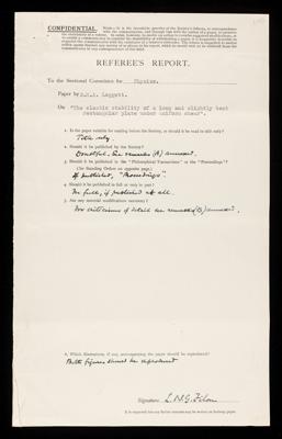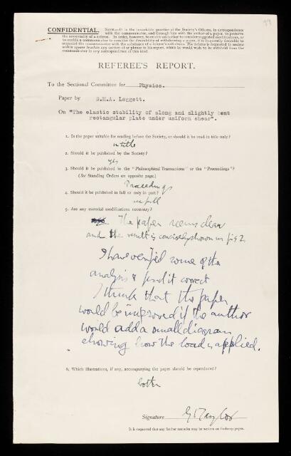 Geoffrey Ingram Taylor, Referee's report by Geoffrey Ingram Taylor, on a paper 'The elastic stability of a long and slightly bent rectangular plate under uniform shear' by D M A Leggett, May 1937, RR/64/99, The Royal Society Archives, London, https://makingscience.royalsociety.org/items/rr_64_99/referees-report-by-geoffrey-ingram-taylor-on-a-paper-the-elastic-stability-of-a-long-and-slightly-bent-rectangular-plate-under-uniform-shear-by-d-m-a-leggett, accessed on 15 February 2026