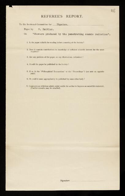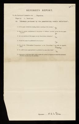Patrick Maynard Stuart Blackett, Referee's report by Paytrick Maynard Stuart Blackett, on a paper 'Showers produced by the penetrating cosmic radiation' by W Heitler, 21 March 1938, RR/65/118, The Royal Society Archives, London, https://makingscience.royalsociety.org/items/rr_65_118/referees-report-by-paytrick-maynard-stuart-blackett-on-a-paper-showers-produced-by-the-penetrating-cosmic-radiation-by-w-heitler, accessed on 15 December 2025
