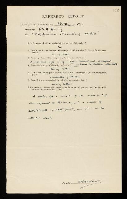Douglas Rayner Hartree, Referee's report by Douglas Rayner Hartree, on a paper 'Diffusion in absorbing media' by P S H Henry, November 1938, RR/65/120, The Royal Society Archives, London, https://makingscience.royalsociety.org/items/rr_65_120/referees-report-by-douglas-rayner-hartree-on-a-paper-diffusion-in-absorbing-media-by-p-s-h-henry, accessed on 13 December 2025