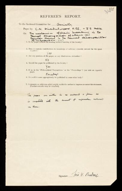 Eric Keightley Rideal, Referee's report by Eric Keightley Rideal, on a paper 'The mechanism of chain breaking in the thermal decomposition of ethane' by Cyril Norman Hishelwood and J E Hobbs, May 1938, RR/65/128, The Royal Society Archives, London, https://makingscience.royalsociety.org/items/rr_65_128/referees-report-by-eric-keightley-rideal-on-a-paper-the-mechanism-of-chain-breaking-in-the-thermal-decomposition-of-ethane-by-cyril-norman-hishelwood-and-j-e-hobbs, accessed on 12 December 2025