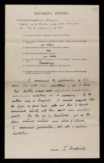 James Chadwick, Referee's report by James Chadwick, on a paper 'The ß-ray spectrum of Ra E' by Leslie Harold Martin and Albert Alan Townsend, October 1938, RR/65/175, The Royal Society Archives, London, https://makingscience.royalsociety.org/items/rr_65_175/referees-report-by-james-chadwick-on-a-paper-the-ß-ray-spectrum-of-ra-e-by-leslie-harold-martin-and-albert-alan-townsend, accessed on 05 December 2025