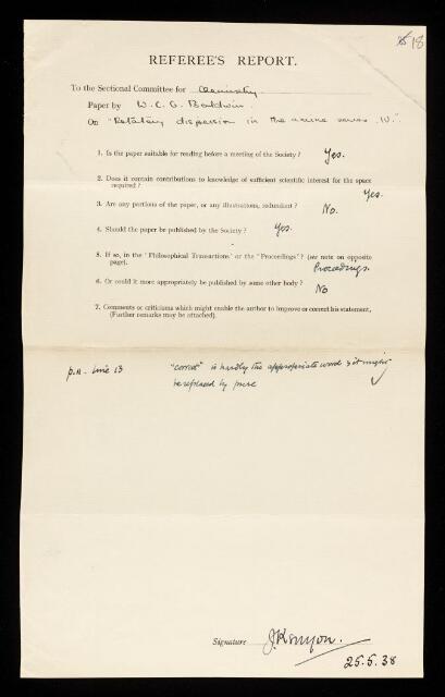 Joseph Kenyon, Referee's report by Joseph Kenyon, on a paper 'Rotatory dispersion in the amine series. IV. The optical activity of diamines' by W C G Baldwin, 25 May 1938, RR/65/18, The Royal Society Archives, London, https://makingscience.royalsociety.org/items/rr_65_18/referees-report-by-joseph-kenyon-on-a-paper-rotatory-dispersion-in-the-amine-series-iv-the-optical-activity-of-diamines-by-w-c-g-baldwin, accessed on 13 February 2026