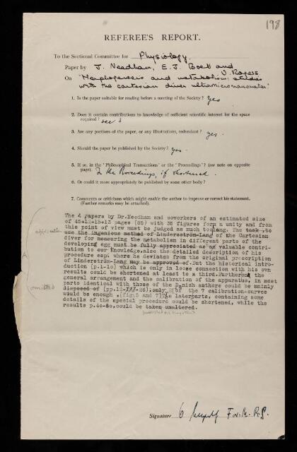 Otto Fritz Meyerhof, Referee's report by Otto Fritz Meyerhof, on a paper 'Morphogenesis and metabolism: studies with the Cartesian diver ultramicro-manometer V. Aerobic glycolysis measurements on the regions of the amphibian gastrula' by Joseph Needham, Veronica Rogers and Shih-chang Shen, 1939, RR/65/198, The Royal Society Archives, London, https://makingscience.royalsociety.org/items/rr_65_198/referees-report-by-otto-fritz-meyerhof-on-a-paper-morphogenesis-and-metabolism-studies-with-the-cartesian-diver-ultramicro-manometer-v-aerobic-glycolysis-measurements-on-the-regions-of-the-amphibian-gastrula-by-joseph-needham-veronica-rogers-and-shih-chang-shen, accessed on 06 December 2025