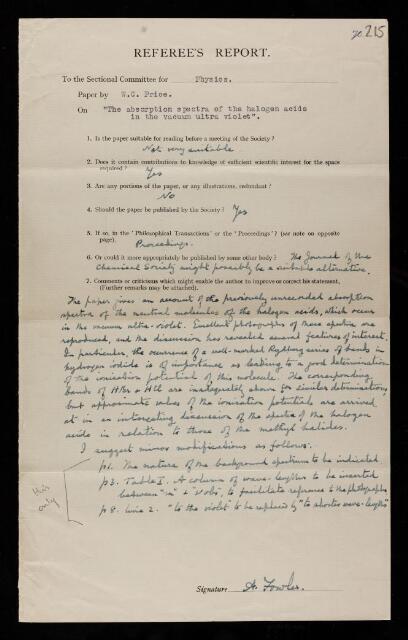 Alfred Fowler, Referee's report by Alfred Fowler, on a paper 'The absorption spectra of the halogen acids in the vacuum ultra-violet' by William Charles Price, May 1938, RR/65/215, The Royal Society Archives, London, https://makingscience.royalsociety.org/items/rr_65_215/referees-report-by-alfred-fowler-on-a-paper-the-absorption-spectra-of-the-halogen-acids-in-the-vacuum-ultra-violet-by-william-charles-price, accessed on 11 November 2025