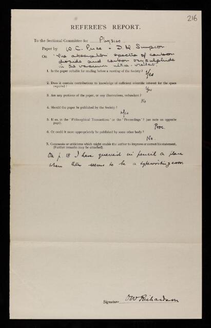 Owen Willans Richardson, Referee's report by Owen Willans Richardson, on a paper 'The absorption spectra of carbon dioxide and carbon oxysulphide in the vacuum ultra-violet' by William Charles Price and Delia M Simpson, 1938, RR/65/216, The Royal Society Archives, London, https://makingscience.royalsociety.org/items/rr_65_216/referees-report-by-owen-willans-richardson-on-a-paper-the-absorption-spectra-of-carbon-dioxide-and-carbon-oxysulphide-in-the-vacuum-ultra-violet-by-william-charles-price-and-delia-m-simpson, accessed on 06 December 2025