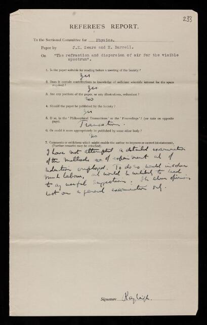 Robert John Strutt, Referee's report by Robert John Strutt, Lord Rayleigh, on a paper 'The refraction and dispersion of air and dispersion of air for the visible spectrum' by J E Sears and H Barrell, June 1938, RR/65/233, The Royal Society Archives, London, https://makingscience.royalsociety.org/items/rr_65_233/referees-report-by-robert-john-strutt-lord-rayleigh-on-a-paper-the-refraction-and-dispersion-of-air-and-dispersion-of-air-for-the-visible-spectrum-by-j-e-sears-and-h-barrell, accessed on 07 November 2025