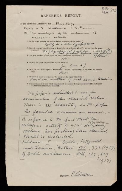 Robert Robinson, Referee's report by Robert Robinson, on a paper 'An analysis of the mechanism of oestrogenic activity' by Nicholas T Werthessen and Gregory Pincus, July 1938, RR/65/272, The Royal Society Archives, London, https://makingscience.royalsociety.org/items/rr_65_272/referees-report-by-robert-robinson-on-a-paper-an-analysis-of-the-mechanism-of-oestrogenic-activity-by-nicholas-t-werthessen-and-gregory-pincus, accessed on 21 January 2026