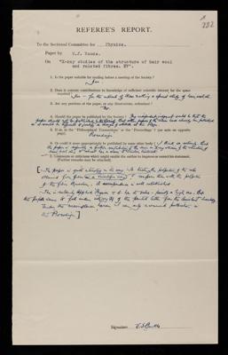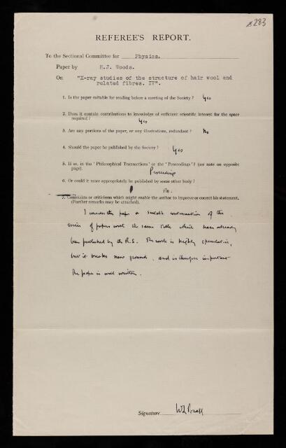 William Lawrence Bragg, Referee's report by William Lawrence Bragg, on a paper 'X-ray studies of the structure of hair, wool, and related fibres. IV. The molecular structure and elastic properties of the biological cells' by H J Woods, February 1938, RR/65/283, The Royal Society Archives, London, https://makingscience.royalsociety.org/items/rr_65_283/referees-report-by-william-lawrence-bragg-on-a-paper-x-ray-studies-of-the-structure-of-hair-wool-and-related-fibres-iv-the-molecular-structure-and-elastic-properties-of-the-biological-cells-by-h-j-woods, accessed on 13 December 2025