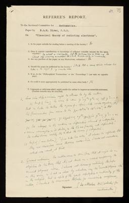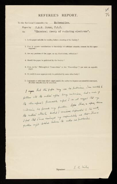 Edward Arthur Milne, Second referee's report by Edward Arthur Milne, on a paper 'Classical theory of radiating electrons' by Paul Adrien Maurice Dirac, 1938, RR/65/74, The Royal Society Archives, London, https://makingscience.royalsociety.org/items/rr_65_74/second-referees-report-by-edward-arthur-milne-on-a-paper-classical-theory-of-radiating-electrons-by-paul-adrien-maurice-dirac, accessed on 10 November 2025
