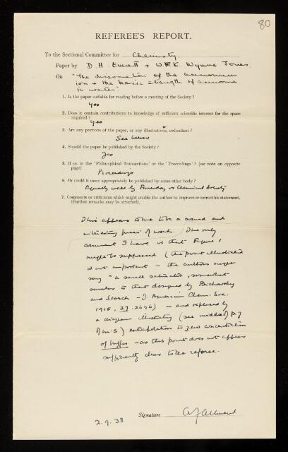 Arthur John Allmand, Referee's report by Arthur John Allmand, on a paper 'The dissociation of the ammonium ion and the basic strength of ammonia in water' by Douglas Hugh Everett and W F K Wynne-Jones, 02 September 1938, RR/65/80, The Royal Society Archives, London, https://makingscience.royalsociety.org/items/rr_65_80/referees-report-by-arthur-john-allmand-on-a-paper-the-dissociation-of-the-ammonium-ion-and-the-basic-strength-of-ammonia-in-water-by-douglas-hugh-everett-and-w-f-k-wynne-jones, accessed on 08 December 2025