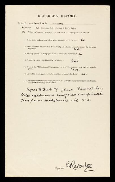 Robert Robertson, Referee's report by Robert Robertson, on a paper 'The infra-red absorption spectrum of methylamine vapour' by C R Bailey, S C Carson and E F Daly, 1939, RR/66/10, The Royal Society Archives, London, https://makingscience.royalsociety.org/items/rr_66_10/referees-report-by-robert-robertson-on-a-paper-the-infra-red-absorption-spectrum-of-methylamine-vapour-by-c-r-bailey-s-c-carson-and-e-f-daly, accessed on 12 November 2025
