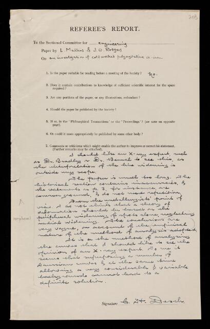 No clear statement regarding publication in the 'Proceedings of the Royal Society of London'. Suggests the paper be submitted to an x-ray expert such as Albert James Bradley or John Desmond Bernal. The paper is too long, and the intoduction contains inaccuracies. Criticises the analyitcal method.
