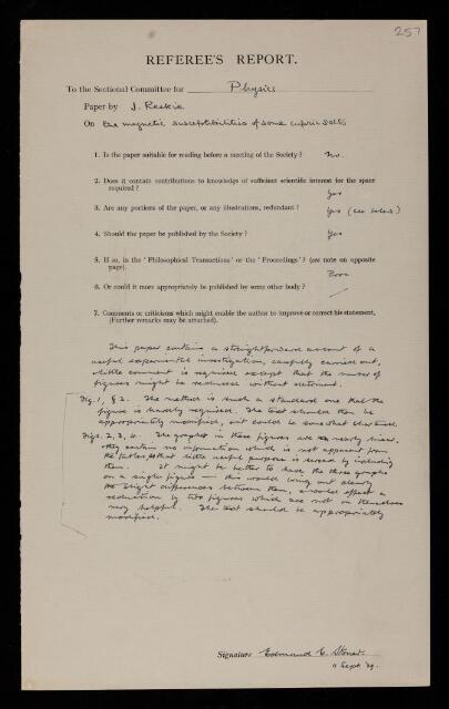 Edmund Clifton Stoner, Referee's report by Edmund Clifton Stoner, on a paper 'The magnetic susceptibilities of some cupric salts' by James Reekie, 11 September 1939, RR/66/257, The Royal Society Archives, London, https://makingscience.royalsociety.org/items/rr_66_257/referees-report-by-edmund-clifton-stoner-on-a-paper-the-magnetic-susceptibilities-of-some-cupric-salts-by-james-reekie, accessed on 17 March 2026