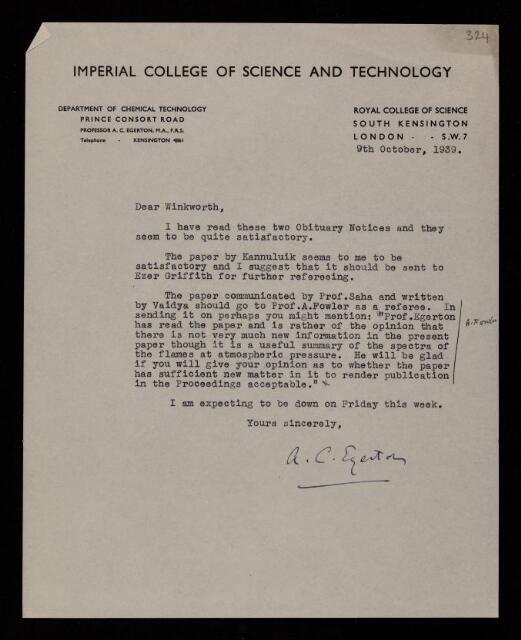 Letter from Alfred Charles Glyn Egerton to Ronald Winckworth, regarding two papers 'A spectroscopic investigation of hydrocarbon flames' and 'Spectroscopic observations on hydrocarbon flames in atomic oxygen' by W M Vaidya, 09 October 1939, RR/66/324, The Royal Society Archives, London, https://makingscience.royalsociety.org/items/rr_66_324/letter-from-alfred-charles-glyn-egerton-to-ronald-winckworth-regarding-two-papers-a-spectroscopic-investigation-of-hydrocarbon-flames-and-spectroscopic-observations-on-hydrocarbon-flames-in-atomic-oxygen-by-w-m-vaidya, accessed on 15 November 2025