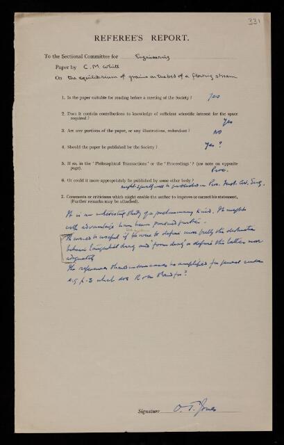 Owen Thomas Jones, Referee's report by Owen Thomas Jones, on a paper 'The equilibrium of grains on the bed of a stream' by C M White, 1939, RR/66/331, The Royal Society Archives, London, https://makingscience.royalsociety.org/items/rr_66_331/referees-report-by-owen-thomas-jones-on-a-paper-the-equilibrium-of-grains-on-the-bed-of-a-stream-by-c-m-white, accessed on 12 November 2025