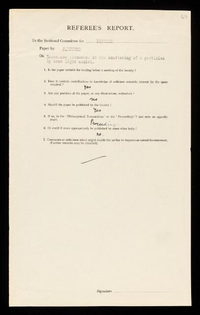 Referee's report by an unnamed referee, on a paper 'Resonance phenomena in the scattering of a-particles by some light nuclei' by Samuel Devons, May 1939, RR/66/69, The Royal Society Archives, London, https://makingscience.royalsociety.org/items/rr_66_69/referees-report-by-an-unnamed-referee-on-a-paper-resonance-phenomena-in-the-scattering-of-a-particles-by-some-light-nuclei-by-samuel-devons, accessed on 23 January 2026
