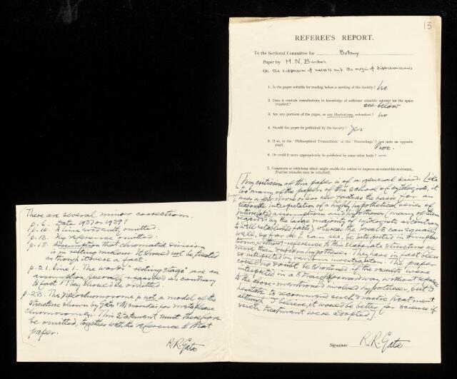 Reginald Ruggles Gates, Referee's report by Reginald Ruggles Gates, on a paper 'The suppression of meiosis and the origin of diplochromosomes' by Horace Newton Barber, September 1939, RR/67/13, The Royal Society Archives, London, https://makingscience.royalsociety.org/items/rr_67_13/referees-report-by-reginald-ruggles-gates-on-a-paper-the-suppression-of-meiosis-and-the-origin-of-diplochromosomes-by-horace-newton-barber, accessed on 10 November 2025