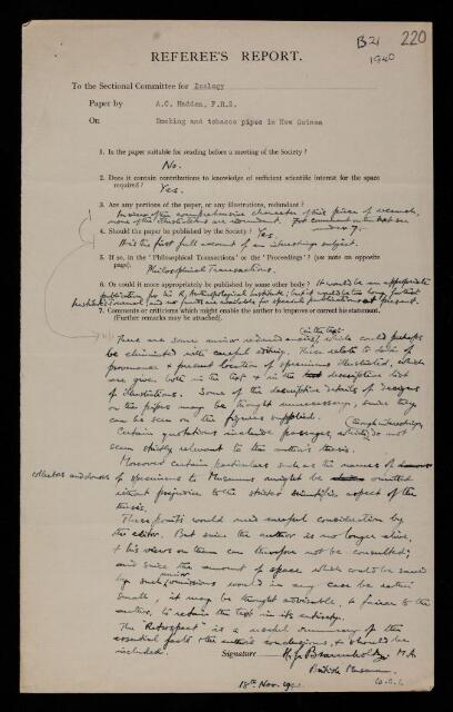 Referee's report by H J Bramholsky, British Museum on a paper 'Smoking and tobacco pipes in New Guinea' by Alfred Cort Haddon, 18 November 1940, RR/67/220, The Royal Society Archives, London, https://makingscience.royalsociety.org/items/rr_67_220/referees-report-by-h-j-bramholsky-british-museum-on-a-paper-smoking-and-tobacco-pipes-in-new-guinea-by-alfred-cort-haddon, accessed on 15 January 2026