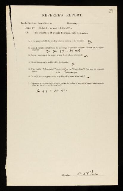 Edmund John Bowen, Referee's report by Edmund John Bowen, on a paper 'The reaction of atomic hydrogen with hydrazine' by E A B Birse and Harry Work Melville, 1940, RR/67/29, The Royal Society Archives, London, https://makingscience.royalsociety.org/items/rr_67_29/referees-report-by-edmund-john-bowen-on-a-paper-the-reaction-of-atomic-hydrogen-with-hydrazine-by-e-a-b-birse-and-harry-work-melville, accessed on 12 December 2025