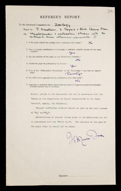 Harold Munro Fox, Referee's report by Harold Munro Fox, on a paper 'Morphogenesis and metabolism: studies with the Cartesian diver ultramicro-manometer V. Aerobic glycolysis measurements on the regions of the amphibian gastrula' by Joseph Needham, Veronica Rogers and Shih-chang Shen, June 1939, RR/67/306, The Royal Society Archives, London, https://makingscience.royalsociety.org/items/rr_67_306/referees-report-by-harold-munro-fox-on-a-paper-morphogenesis-and-metabolism-studies-with-the-cartesian-diver-ultramicro-manometer-v-aerobic-glycolysis-measurements-on-the-regions-of-the-amphibian-gastrula-by-joseph-needham-veronica-rogers-and-shih-chang-shen, accessed on 13 November 2025