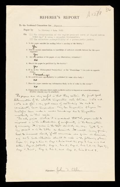 John Frank Allen, Referee's report by John Frank Allen, on two papers 'The determination of the vapour-pressure curve of liquid helium below 1.6° K using a magnetic thermometer' and 'The effective susceptibility of a paramagnetic powder' by Brebis Bleaney and R A Hull, December 1940, RR/67/34, The Royal Society Archives, London, https://makingscience.royalsociety.org/items/rr_67_34/referees-report-by-john-frank-allen-on-two-papers-the-determination-of-the-vapour-pressure-curve-of-liquid-helium-below-16-k-using-a-magnetic-thermometer-and-the-effective-susceptibility-of-a-paramagnetic-powder-by-brebis-bleaney-and-r-a-hull, accessed on 16 January 2026