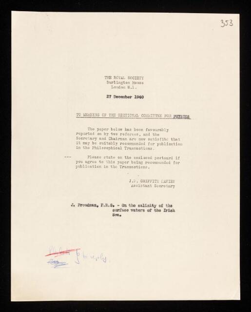 Charles Drummond Ellis, William Wilson, William Edward Curtis, George Paget Thomson, James Chadwick, Gordon Miller Bourne Dobson, Letter from J D Griffith Davies, Assistant Secretary of the Royal Society, on a paper 'On the salinity of the surface waters of the Irish Sea' by Joseph Proudman to members of the Sectional Committee for Physics, 27 December 1940, RR/67/353, The Royal Society Archives, London, https://makingscience.royalsociety.org/items/rr_67_353/letter-from-j-d-griffith-davies-assistant-secretary-of-the-royal-society-on-a-paper-on-the-salinity-of-the-surface-waters-of-the-irish-sea-by-joseph-proudman-to-members-of-the-sectional-committee-for-physics, accessed on 19 January 2026