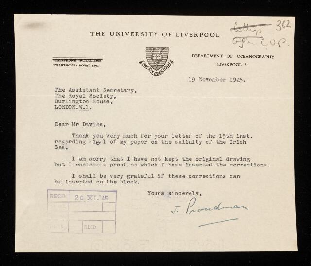 Letter from Joseph Proudman, on his paper 'On the salinity of the surface waters of the Irish Sea' to J D Griffith Davies, Assistant Secretary of the Royal Society, 19 November 1945, RR/67/362, The Royal Society Archives, London, https://makingscience.royalsociety.org/items/rr_67_362/letter-from-joseph-proudman-on-his-paper-on-the-salinity-of-the-surface-waters-of-the-irish-sea-to-j-d-griffith-davies-assistant-secretary-of-the-royal-society, accessed on 09 February 2026