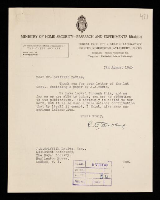 Reginald Edward Stradling, Letter from Reginald Edward Stradling, Ministry of Home Security on a paper 'The production of waves by the sudden release of a spherical distribution of compressed air in the atmosphere' by J J Unwin to J D Griffith Daviees, Assistant Secretary of the Royal Society, 07 August 1940, RR/67/421, The Royal Society Archives, London, https://makingscience.royalsociety.org/items/rr_67_421/letter-from-reginald-edward-stradling-ministry-of-home-security-on-a-paper-the-production-of-waves-by-the-sudden-release-of-a-spherical-distribution-of-compressed-air-in-the-atmosphere-by-j-j-unwin-to-j-d-griffith-daviees-assistant-secretary-of-the-royal-society, accessed on 09 March 2026
