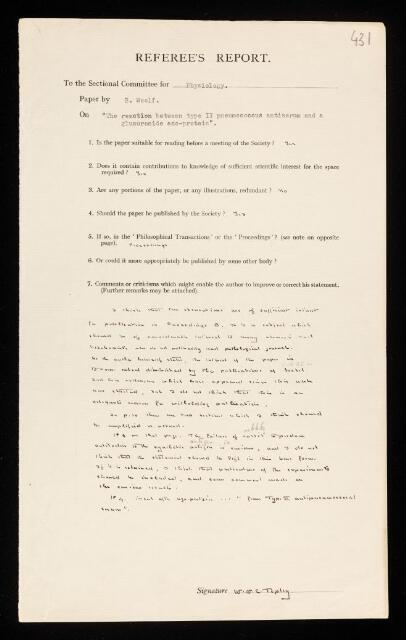 William Whiteman Carlton Topley, Referee's report by William Whiteman Carlton Topley, on a paper 'The reaction between type II pneumococcus antiserum and a glucuronide azo-protein' by Barnet Woolf, 1939, RR/67/431, The Royal Society Archives, London, https://makingscience.royalsociety.org/items/rr_67_431/referees-report-by-william-whiteman-carlton-topley-on-a-paper-the-reaction-between-type-ii-pneumococcus-antiserum-and-a-glucuronide-azo-protein-by-barnet-woolf, accessed on 17 December 2025