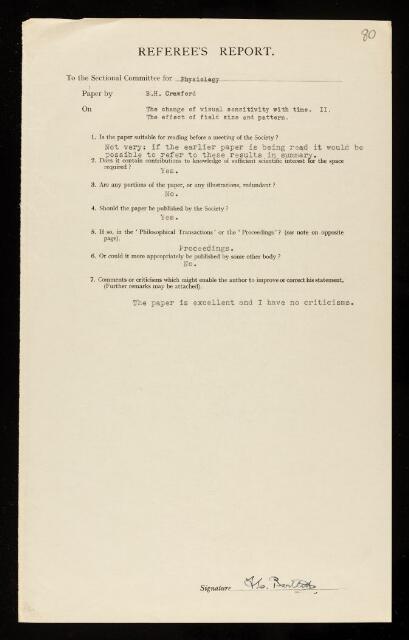 Frederic Charles Bartlett, Referee's report by Frederic Charles Bartlett, on a paper 'The change of visual sensitivity with time. II. The effect of field size and pattern' by B H Crawford, April 1940, RR/67/80, The Royal Society Archives, London, https://makingscience.royalsociety.org/items/rr_67_80/referees-report-by-frederic-charles-bartlett-on-a-paper-the-change-of-visual-sensitivity-with-time-ii-the-effect-of-field-size-and-pattern-by-b-h-crawford, accessed on 16 March 2026