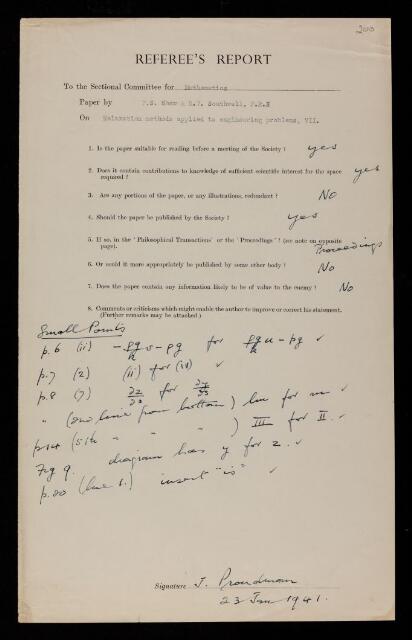 Joseph Proudman, Referee's report by Joseph Proudman, on a paper 'Relaxation methods applied to engineering problems. VII. Problems relating to the percolation of fluids through porous materials' by F S Shaw and Richard Vynne Southwell, 23 January 1941, RR/68/200, The Royal Society Archives, London, https://makingscience.royalsociety.org/items/rr_68_200/referees-report-by-joseph-proudman-on-a-paper-relaxation-methods-applied-to-engineering-problems-vii-problems-relating-to-the-percolation-of-fluids-through-porous-materials-by-f-s-shaw-and-richard-vynne-southwell, accessed on 14 December 2025