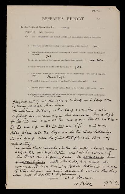Augustus Daniel Imms, Referee's report by Augustus Daniel Imms, on a paper 'The integument and moult cycle of Tegenaria atrica (Araneae)' by H C Browning, 18 March 1942, RR/68/219, The Royal Society Archives, London, https://makingscience.royalsociety.org/items/rr_68_219/referees-report-by-augustus-daniel-imms-on-a-paper-the-integument-and-moult-cycle-of-tegenaria-atrica-araneae-by-h-c-browning, accessed on 20 April 2026