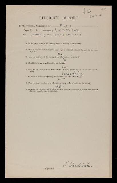 James Chadwick, Referee's report by James Chadwick, on a paper 'Penetrating non-ionizing cosmic rays' by L Jánossy and George Dixon Rochester, 1942, RR/68/234, The Royal Society Archives, London, https://makingscience.royalsociety.org/items/rr_68_234/referees-report-by-james-chadwick-on-a-paper-penetrating-non-ionizing-cosmic-rays-by-l-jánossy-and-george-dixon-rochester, accessed on 07 November 2025