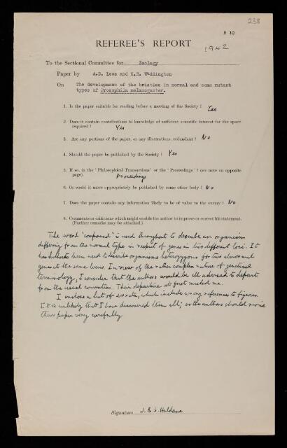 John Burdon Sanderson Haldane, Referee's report by John Burdon Sanderson Haldane, on a paper 'The development of the bristles in normal and some mutant types of Drosophila melanogaster' by Anthony David Lees and Conrad Hal Waddington, 1942, RR/68/238, The Royal Society Archives, London, https://makingscience.royalsociety.org/items/rr_68_238/referees-report-by-john-burdon-sanderson-haldane-on-a-paper-the-development-of-the-bristles-in-normal-and-some-mutant-types-of-drosophila-melanogaster-by-anthony-david-lees-and-conrad-hal-waddington, accessed on 15 February 2026
