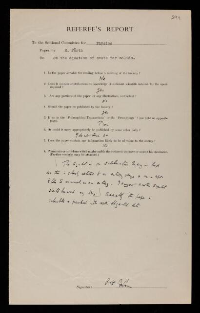 Ralph Howard Fowler, Referee's report by Ralph Howard Fowler, on a paper 'On the equation of state for solids' by R Fürth, 1943, RR/68/294, The Royal Society Archives, London, https://makingscience.royalsociety.org/items/rr_68_294/referees-report-by-ralph-howard-fowler-on-a-paper-on-the-equation-of-state-for-solids-by-r-fürth, accessed on 08 March 2026