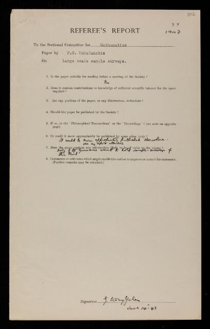 George Udny Yule, Referee's report by George Udny Yule, on a paper 'On large-scale sample surveys' by Prasanta Chandra Mahalanobis, 14 June 1943, RR/68/392, The Royal Society Archives, London, https://makingscience.royalsociety.org/items/rr_68_392/referees-report-by-george-udny-yule-on-a-paper-on-large-scale-sample-surveys-by-prasanta-chandra-mahalanobis, accessed on 08 November 2025