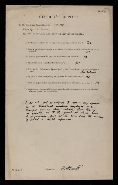 Reginald Crundall Punnett, Referee's report by Reginald Crundall Punnett, on a paper 'The genetical activity of heterochromatin' by Kenneth Mather, 07 November 1943, RR/68/393, The Royal Society Archives, London, https://makingscience.royalsociety.org/items/rr_68_393/referees-report-by-reginald-crundall-punnett-on-a-paper-the-genetical-activity-of-heterochromatin-by-kenneth-mather, accessed on 08 November 2025