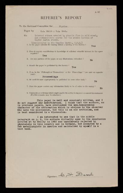 Cecil Henry Desch, Referee's report by Cecil Henry Desch, on a paper 'Internal stress created by plastic flow in mild steel, and stress-strain curves for the atomic lattice of higher carbon steels' by S L Smith and W A Wood, 1943, RR/68/404, The Royal Society Archives, London, https://makingscience.royalsociety.org/items/rr_68_404/referees-report-by-cecil-henry-desch-on-a-paper-internal-stress-created-by-plastic-flow-in-mild-steel-and-stress-strain-curves-for-the-atomic-lattice-of-higher-carbon-steels-by-s-l-smith-and-w-a-wood, accessed on 16 March 2026