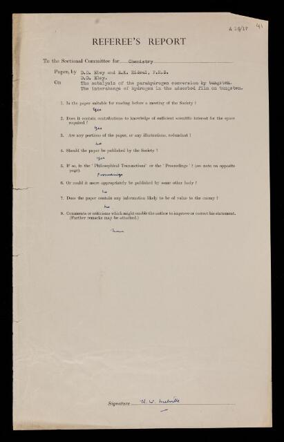 Harry Work Melville, Referee's report by Harry Work Melville, on two papers 'The catalysis of the parahydrogen conversion by tungsten' by Daniel Douglas Eley and Eric Keightley Rideal, and 'The interchange of hydrogen in the adsorbed film on tungsten' by Daniel Douglas Eley, June 1941, RR/68/41, The Royal Society Archives, London, https://makingscience.royalsociety.org/items/rr_68_41/referees-report-by-harry-work-melville-on-two-papers-the-catalysis-of-the-parahydrogen-conversion-by-tungsten-by-daniel-douglas-eley-and-eric-keightley-rideal-and-the-interchange-of-hydrogen-in-the-adsorbed-film-on-tungsten-by-daniel-douglas-eley, accessed on 18 April 2026