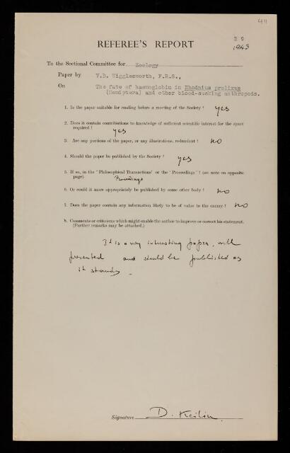 David Keilin, Referee's report by David Keilin, on a paper 'The fate of haemoglobin in Rhodnius prolixus (Hemiptera) and other blood-sucking arthropods' by Vincent Brian Wigglesworth, 1943, RR/68/411, The Royal Society Archives, London, https://makingscience.royalsociety.org/items/rr_68_411/referees-report-by-david-keilin-on-a-paper-the-fate-of-haemoglobin-in-rhodnius-prolixus-hemiptera-and-other-blood-sucking-arthropods-by-vincent-brian-wigglesworth, accessed on 13 January 2026