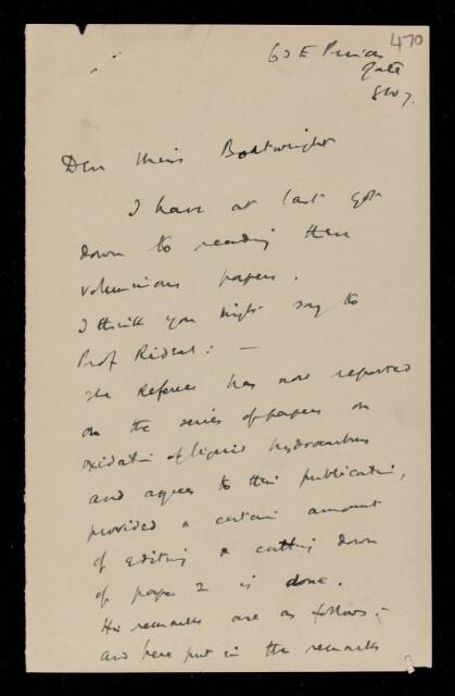 Alfred Charles Glyn Egerton, Letter from Alfred Charles Glyn Egerton, to Miss Boatwright, regarding two papers 'The oxidation of liquid hydrocarbons. I. The chain formation of hydroperoxides and their decomposition' by Philip George, Eric Keightley Rideal and Alan Robertson, and 'The oxidation of liquid hydrocarbons II. The energy-chain mechanism for the thermal oxidation of tetralin' by Philip George and Alan Robertson, 1944, RR/68/470, The Royal Society Archives, London, https://makingscience.royalsociety.org/items/rr_68_470/letter-from-alfred-charles-glyn-egerton-to-miss-boatwright-regarding-two-papers-the-oxidation-of-liquid-hydrocarbons-i-the-chain-formation-of-hydroperoxides-and-their-decomposition-by-philip-george-eric-keightley-rideal-and-alan-robertson-and-the-oxidation-of-liquid-hydrocarbons-ii-the-energy-chain-mechanism-for-the-thermal-oxidation-of-tetralin-by-philip-george-and-alan-robertson, accessed on 15 November 2025