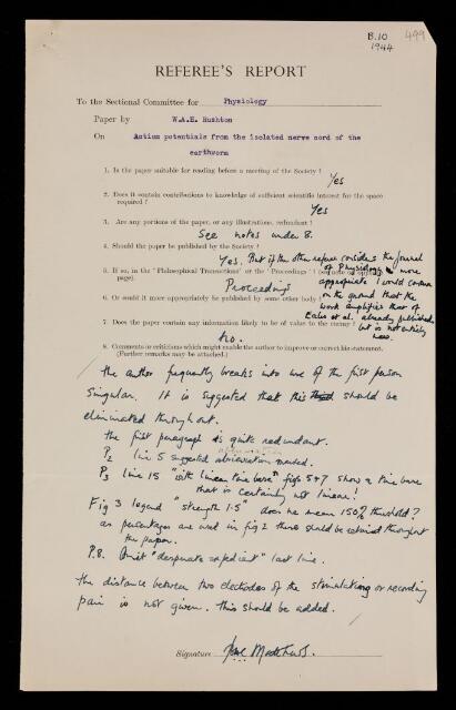Bryan Harold Cabot Matthews, Referee's report by Bryan Harold Cabot Matthews, on a paper 'Action potentials from the isolated nerve cord of the earthworm' by William Albert Hugh Rushton, 1944, RR/68/499, The Royal Society Archives, London, https://makingscience.royalsociety.org/items/rr_68_499/referees-report-by-bryan-harold-cabot-matthews-on-a-paper-action-potentials-from-the-isolated-nerve-cord-of-the-earthworm-by-william-albert-hugh-rushton, accessed on 05 December 2025