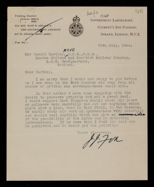 Harold Brewer Hartley, Letter from John Jacob Fox, to Harold Brewer Hartley, regarding two papers 'The infra-red spectra of polymers and related monomers. I' and 'The infra-red spectra of polymers and related monomers. II' by Harold Warris Thompson and P Torkington, 28 July 1944, RR/68/505, The Royal Society Archives, London, https://makingscience.royalsociety.org/items/rr_68_505/letter-from-john-jacob-fox-to-harold-brewer-hartley-regarding-two-papers-the-infra-red-spectra-of-polymers-and-related-monomers-i-and-the-infra-red-spectra-of-polymers-and-related-monomers-ii-by-harold-warris-thompson-and-p-torkington, accessed on 16 February 2026