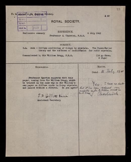 Memoranda, on a paper 'Diffuse scattering of X-rays by crystals - The Faxén-Waller theory and the surfaces of isodiffusion for cubic crystals' by H A Jahn, 11 July 1941, RR/68/88, The Royal Society Archives, London, https://makingscience.royalsociety.org/items/rr_68_88/memoranda-on-a-paper-diffuse-scattering-of-x-rays-by-crystals-the-faxén-waller-theory-and-the-surfaces-of-isodiffusion-for-cubic-crystals-by-h-a-jahn, accessed on 17 December 2025