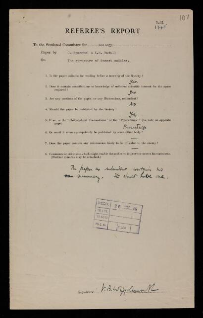 Vincent Brian Wigglesworth, Referee's report by Vincent Brian Wigglesworth, on a paper 'The structure of insect cuticles' by G Fraenkel and K M Rudall, September 1945, RR/69/107, The Royal Society Archives, London, https://makingscience.royalsociety.org/items/rr_69_107/referees-report-by-vincent-brian-wigglesworth-on-a-paper-the-structure-of-insect-cuticles-by-g-fraenkel-and-k-m-rudall, accessed on 16 March 2026
