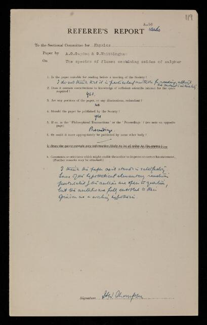 Harold Warris Thompson, Referee's report by Harold Warris Thompson, on a paper 'The spectra of flames containing oxides of sulphur' by Alfred Gordon Gaydon and G. Whittingham, 1946, RR/69/119, The Royal Society Archives, London, https://makingscience.royalsociety.org/items/rr_69_119/referees-report-by-harold-warris-thompson-on-a-paper-the-spectra-of-flames-containing-oxides-of-sulphur-by-alfred-gordon-gaydon-and-g-whittingham, accessed on 06 February 2026