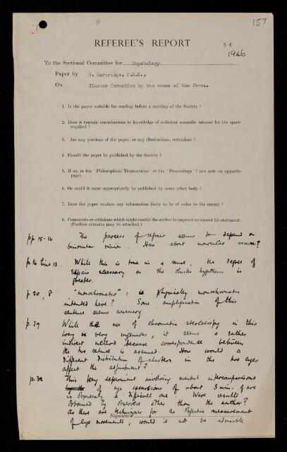 Walter Stanley Stiles, Referee's report by Walter Stanley Stiles, on a paper 'Cluster formation by the cones of the fovea' by Hamilton Hartridge, 1946, RR/69/157, The Royal Society Archives, London, https://makingscience.royalsociety.org/items/rr_69_157/referees-report-by-walter-stanley-stiles-on-a-paper-cluster-formation-by-the-cones-of-the-fovea-by-hamilton-hartridge, accessed on 14 November 2025